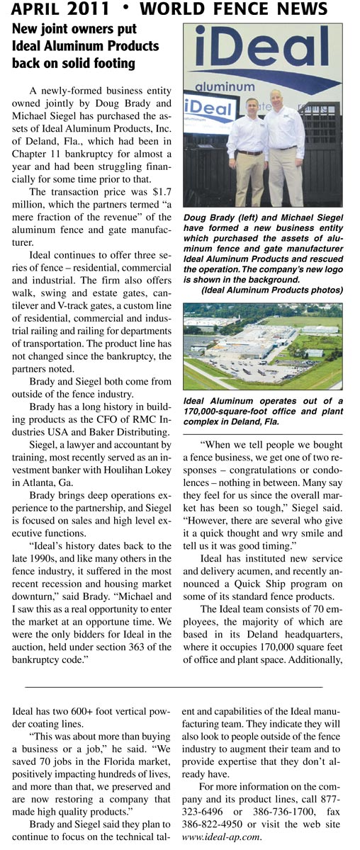 Deland, Florida - The upcoming April 2011 issue of World Fence News features an article profiling Ideal Aluminum Products. The article focuses on the acquisition of Ideal Aluminum Products and the activity to restore Ideal to its rightful place as one of the leading aluminum fence, gates and railing companies in the industry.